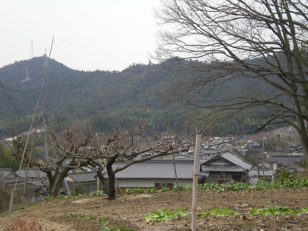 桃畑のむこうの小山には神社がある。