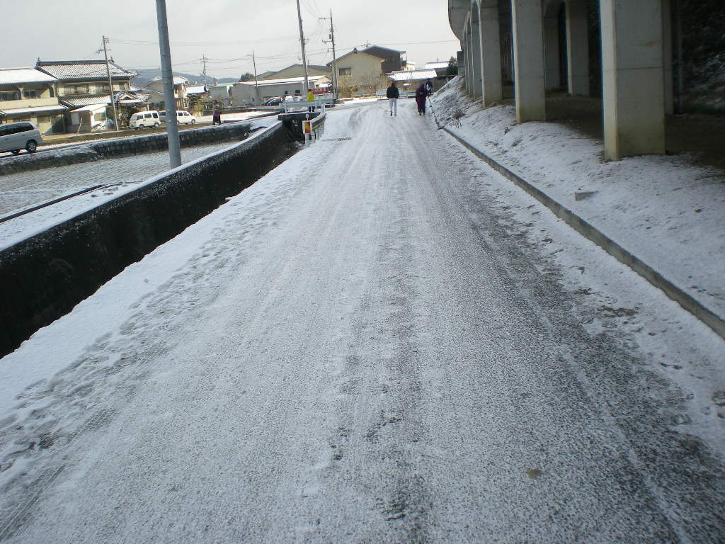 井原線の高架下の道は車どころか、人がすべってひっくり返りそうな雪道。