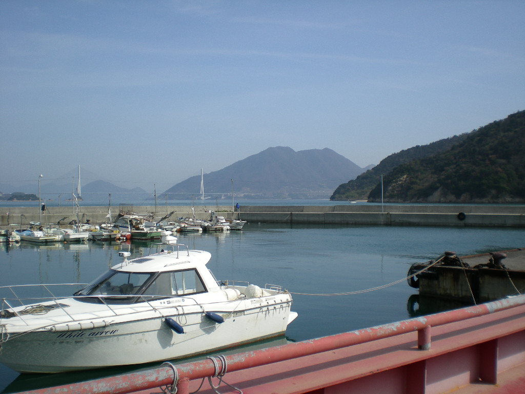 瀬戸港には釣り人がいる、その向こうの山は伯方島の宝股山。