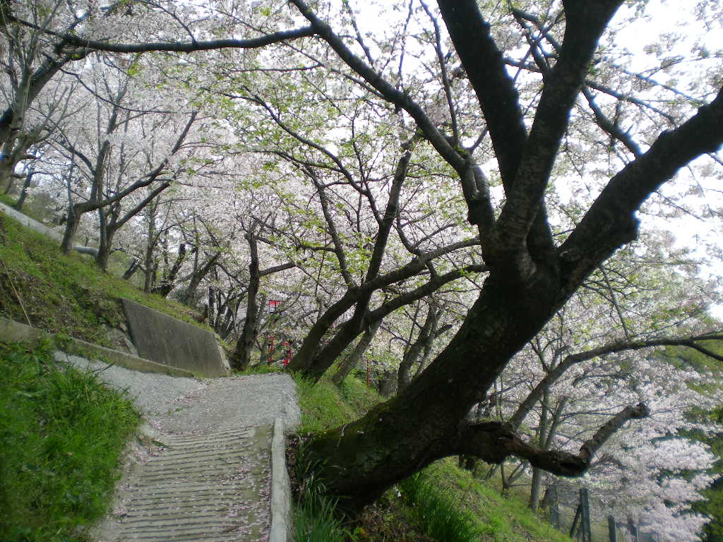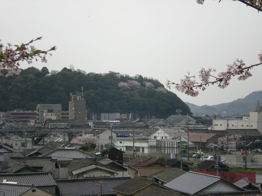 桜の木のあいだから古城山を見れば、そこもまだ桜がある。