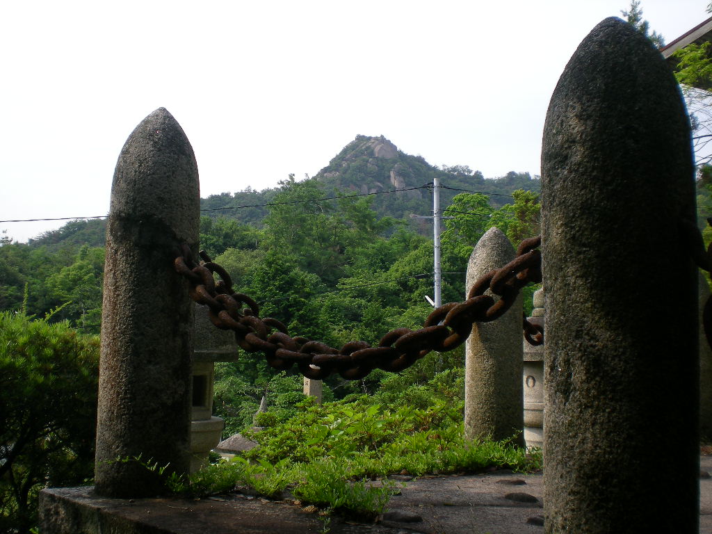 陸軍大将宇垣一成書による「忠魂碑」の、それを囲む砲丸と鎖。