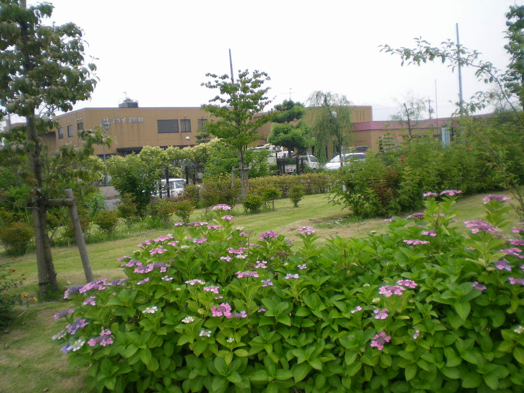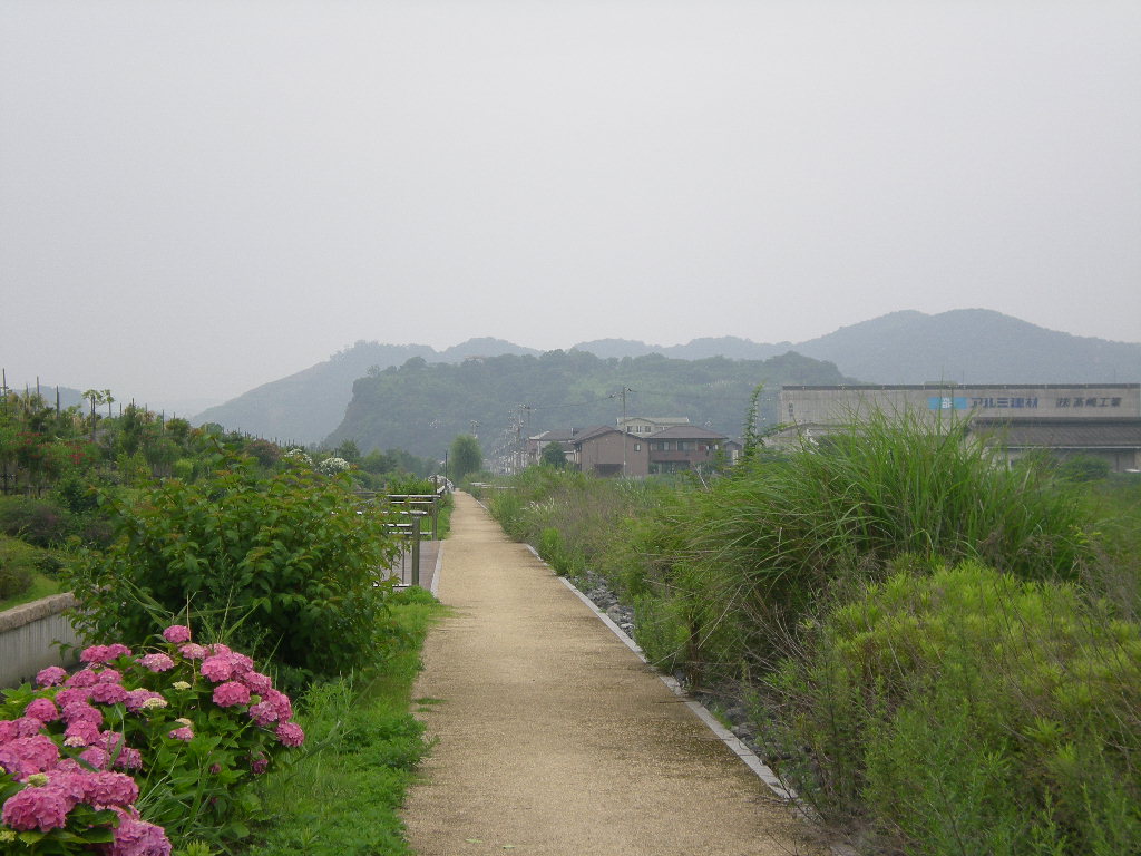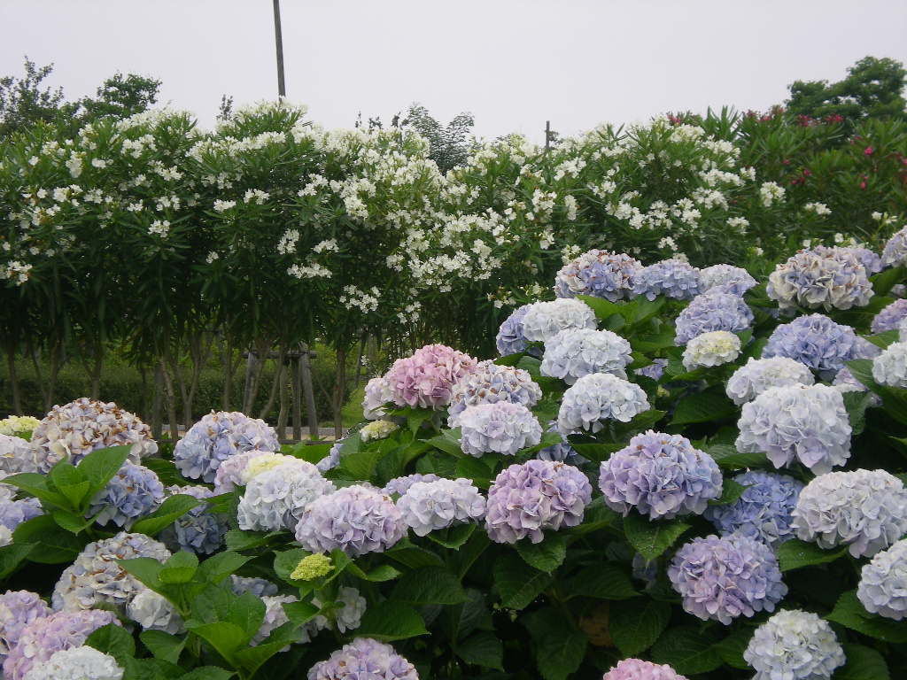遊水地の道に咲くアジサイ。