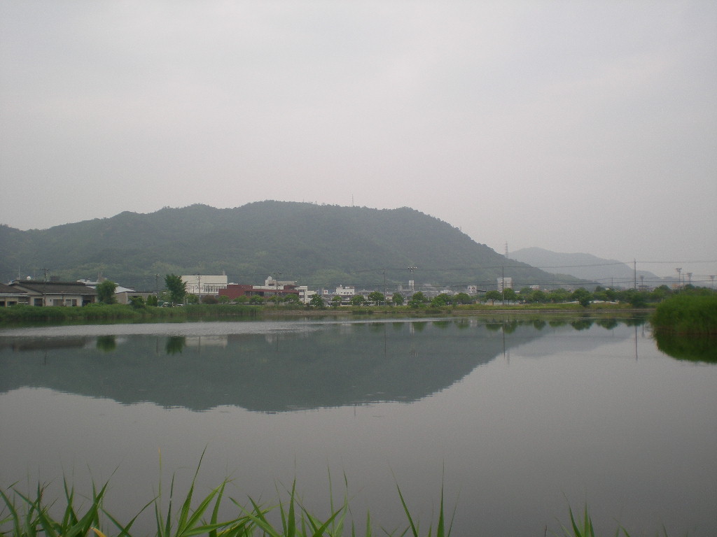 曇り空、応神山が鏡のように映っている。