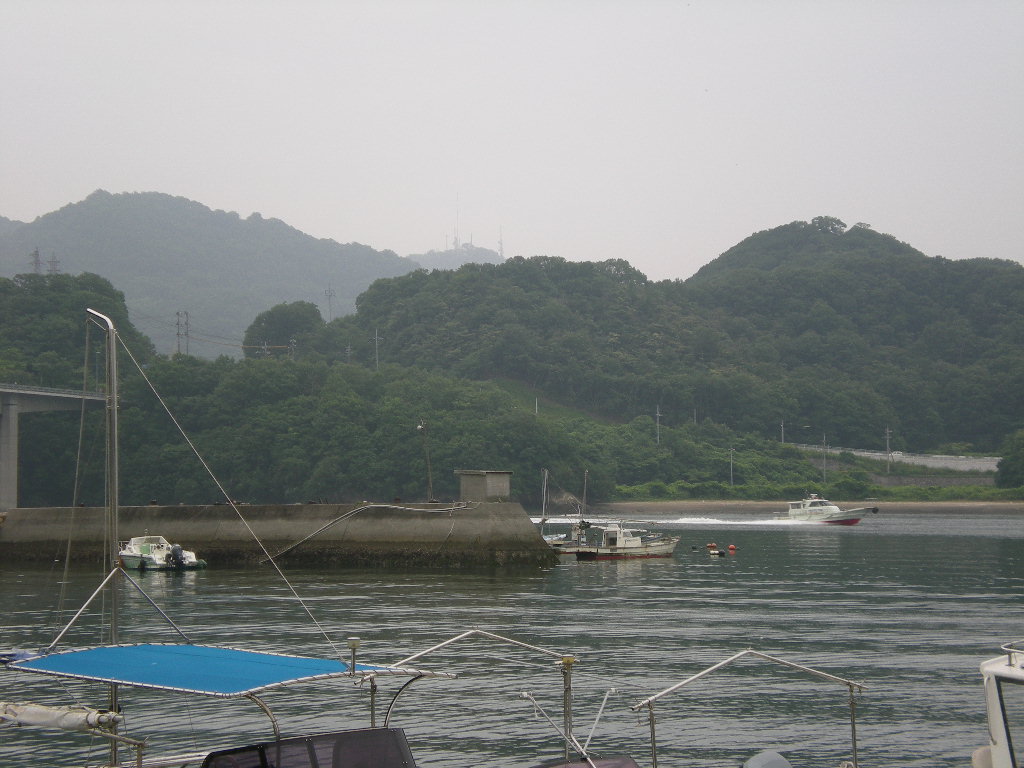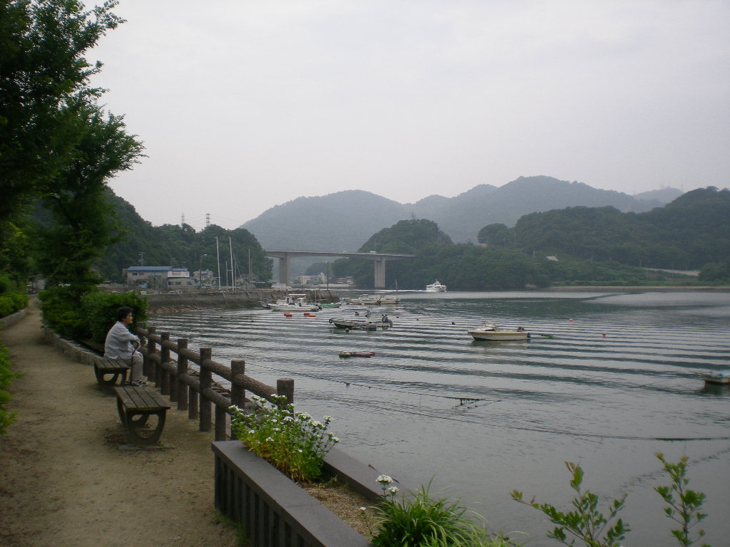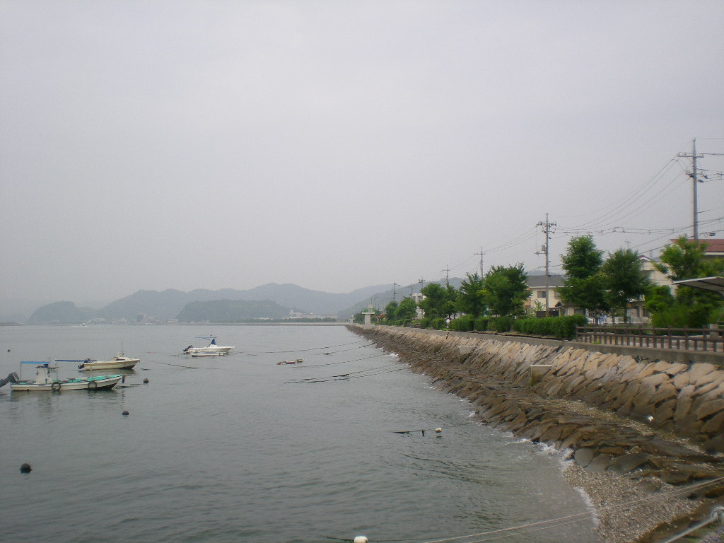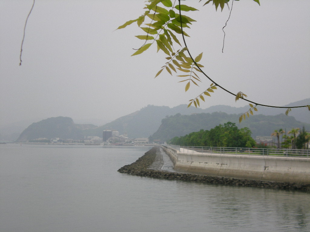 横島港から振り返り見る美の浜緑道公園。遠くに古城山と十一番町緑道公園。