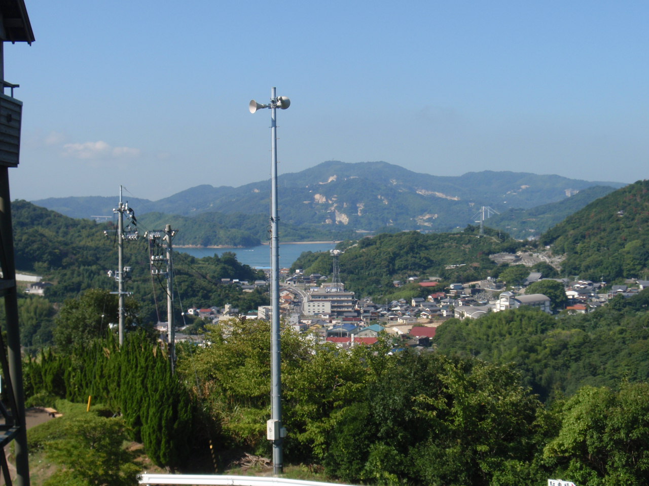 (天守閣から見る木浦の町方向、背後は大島、少し伯方・大島大橋の塔が見えている)