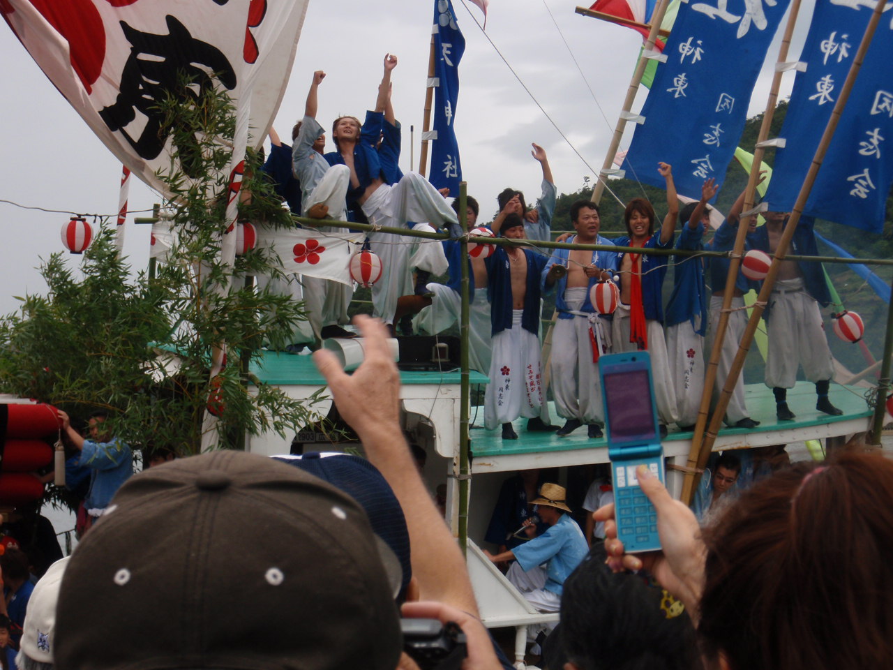 石船の上にあがった若者は天に向かうほど元気そう。