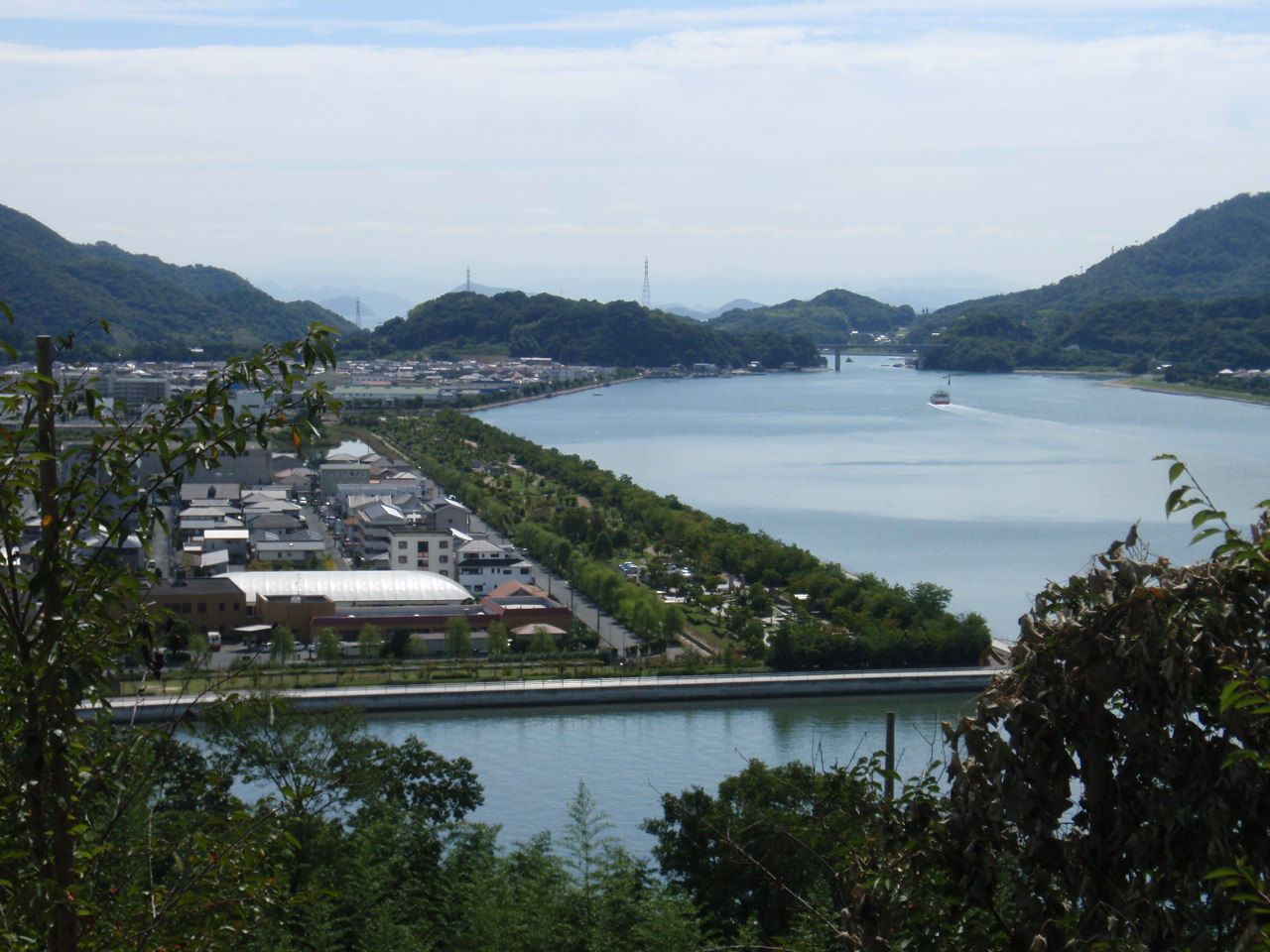 城山から見る笠岡水道。今日の海の青、空の青、そして静けさは、島に向かうフェリーの美しさを引き立てていた。
