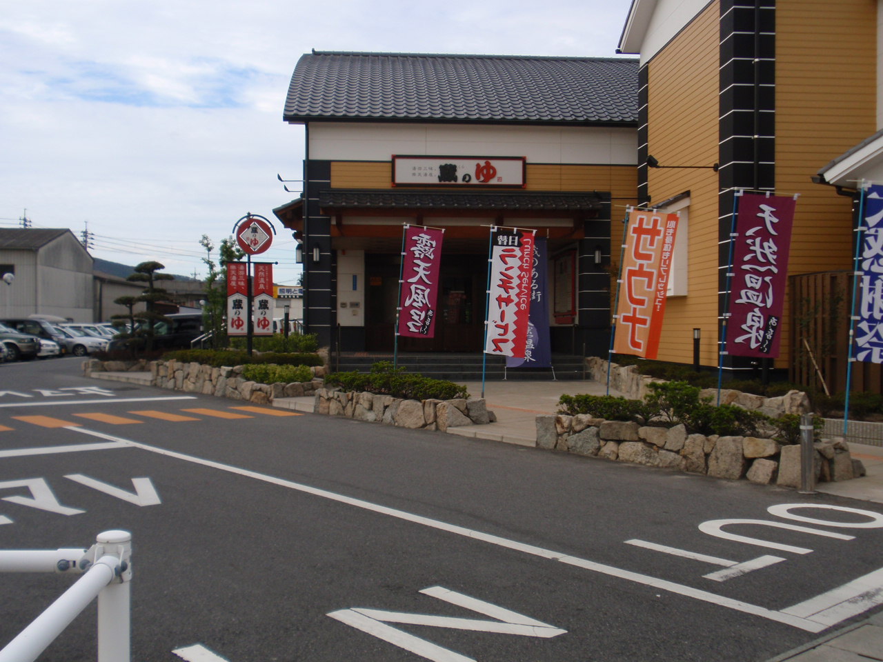 「天然温泉」の旗が揺れる。