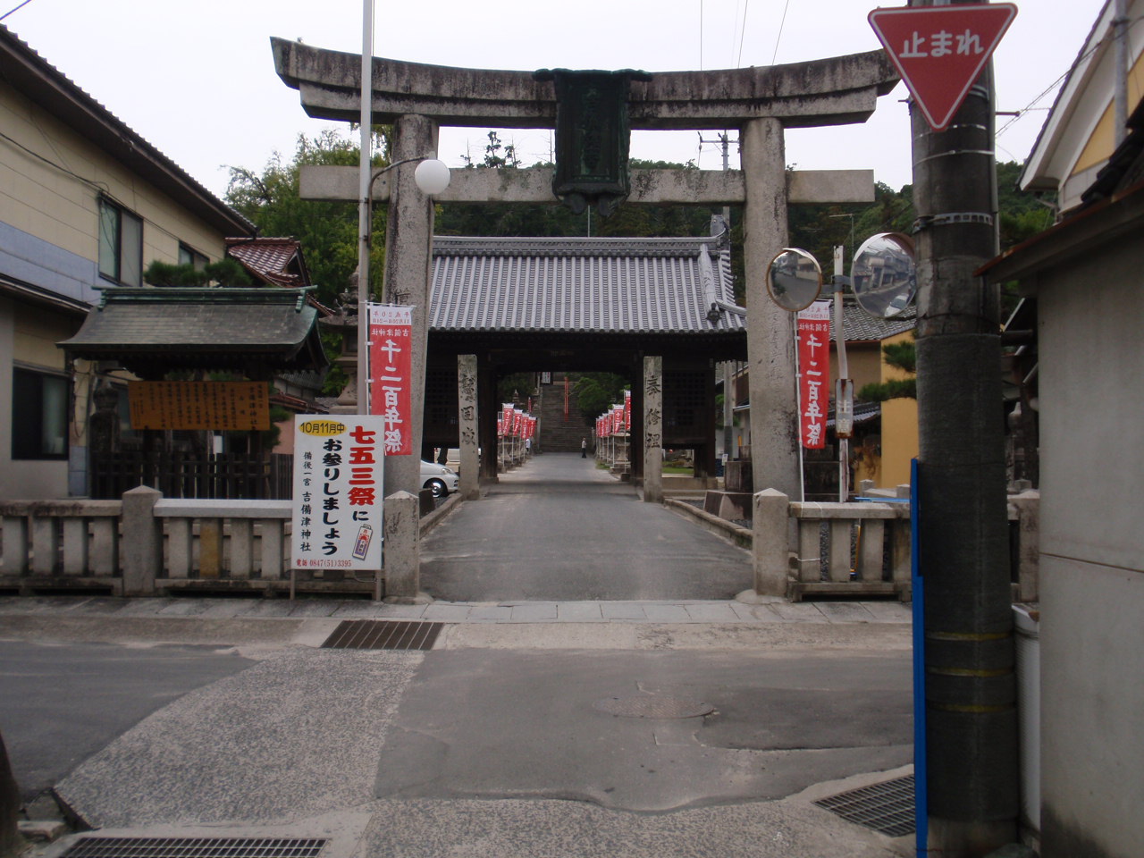 正面が吉備津神社。鳥居の前は、古くからの道に民家や商家が並んでいる。