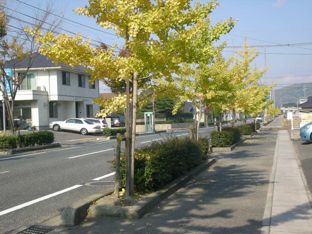 美の浜の中を通る道、この道のイチョウはまだ小木だけど距離が長い。700〜800mほど銀杏並木がつづいている。