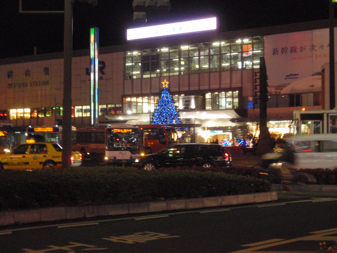 あそに見える岡山駅前のツリー。あれがモモタローファンタジーのメインになるツリーじゃな。