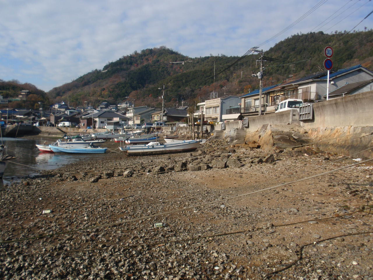 平の海岸、小石に牡蠣がこびりついている。