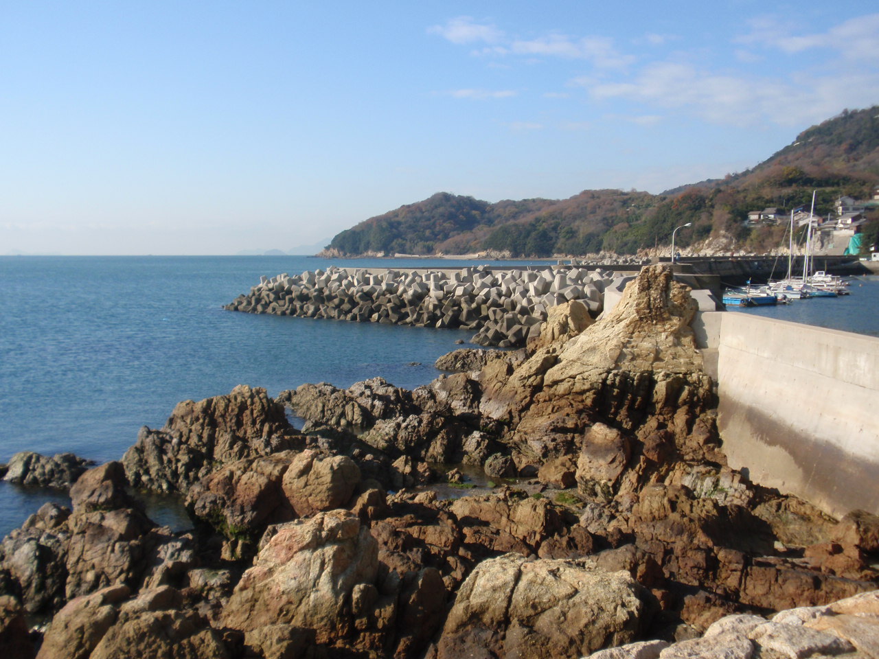 防波堤から見る西、阿伏兎観音方向。海の色は真っ青。