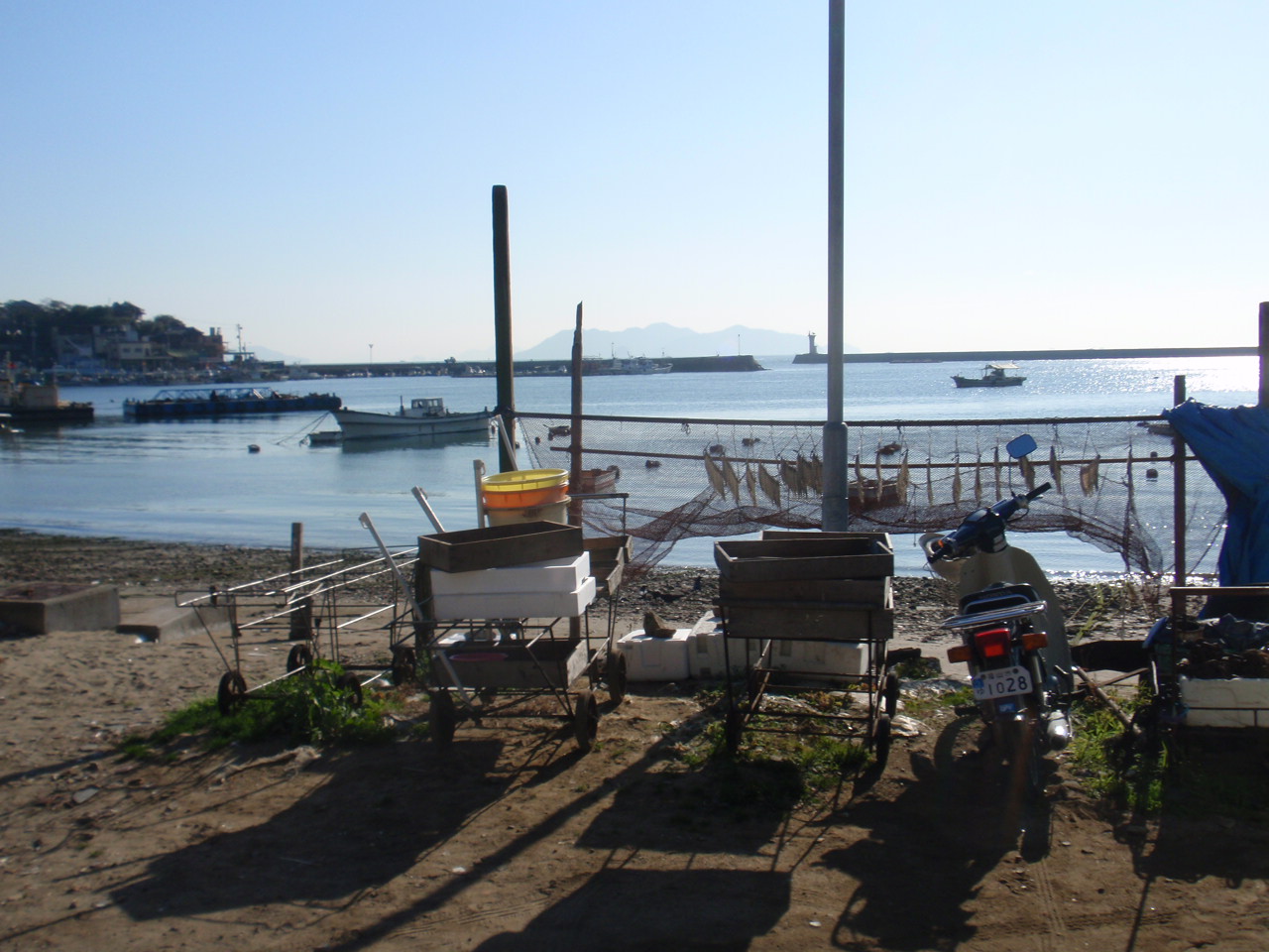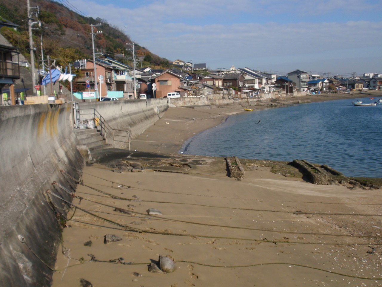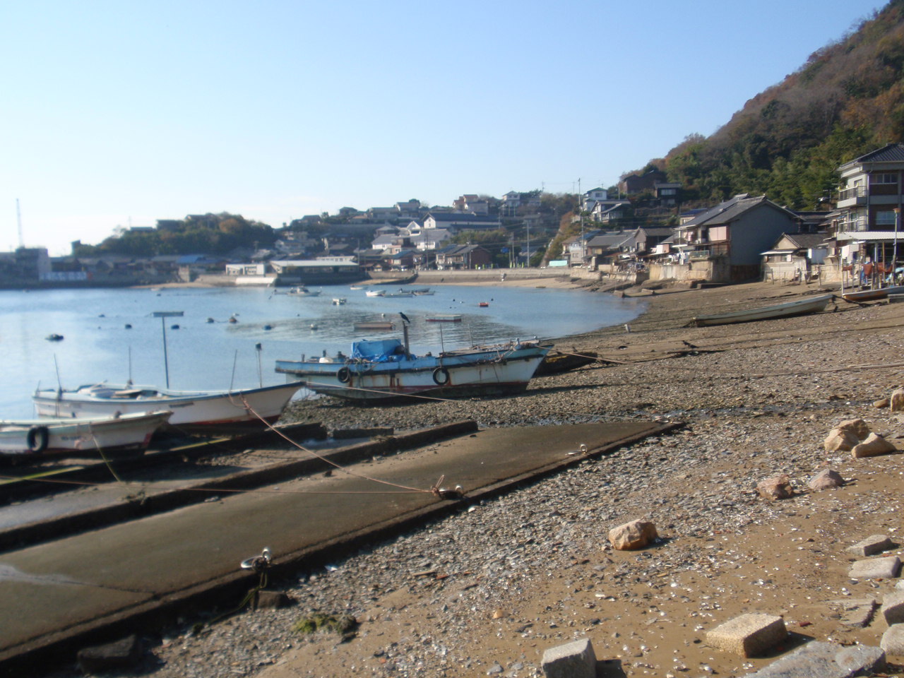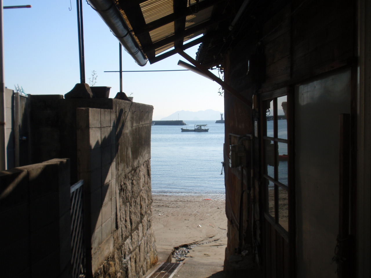 砂浜の民家の軒先にはサヨリなどが干されている、冬の鞆。