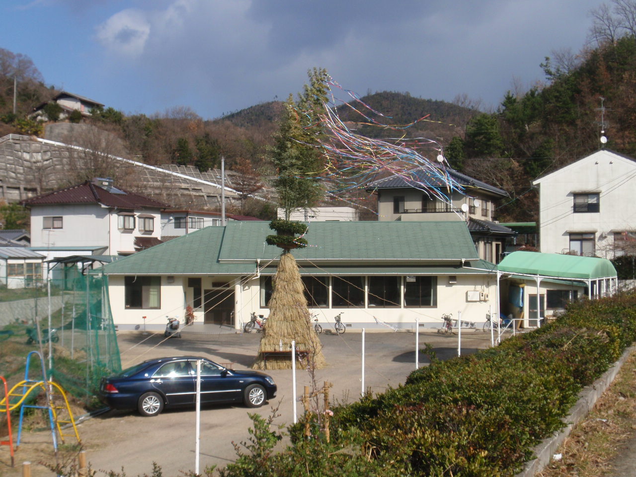 集会所からは昼食後の宴が真っ最中、カラオケの音響が強風に負けず響いていた。