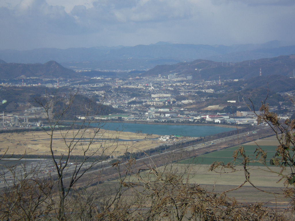 正面のまるい山が古城山。