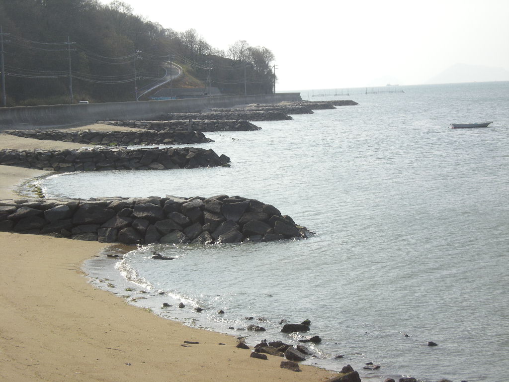 長浜の海には消波ブロックが積み重ねてある。すこしだけ砂浜が残る。