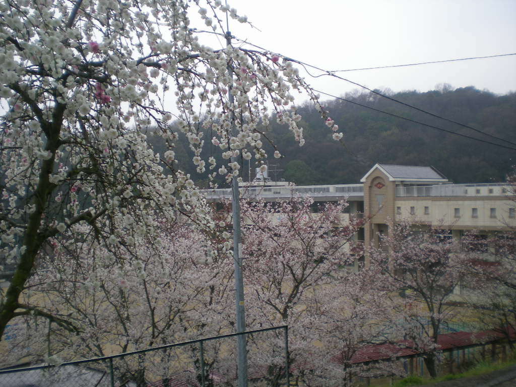陶山小学校の校門から見る押撫の桜と桃の花。