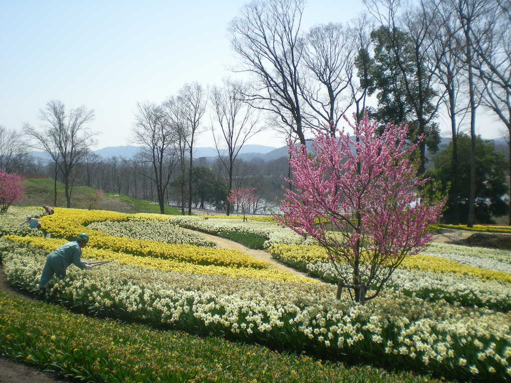 色褪せたスイセンはおじさん・おばさん数人で刈り取られている。