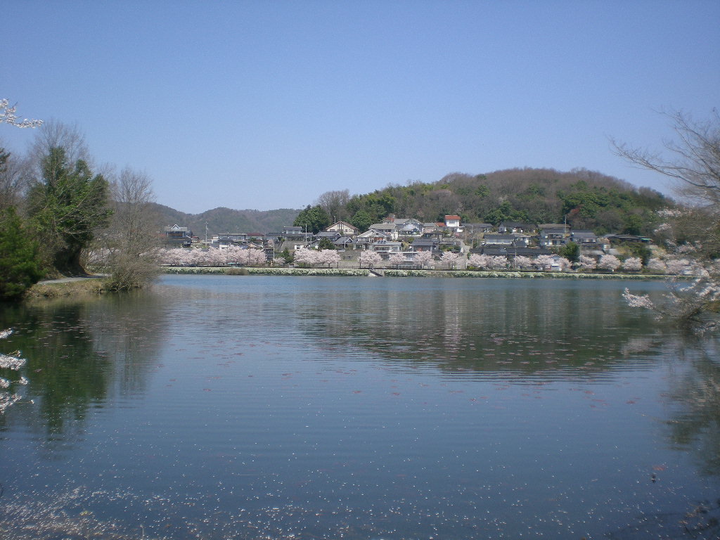 正面に桜が見え、多少不似合いな民家が背後に並んでいる。
