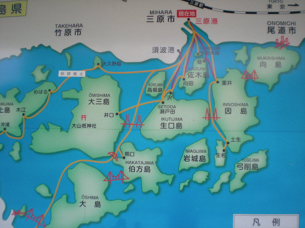 三原港ターミナルにある航路図。