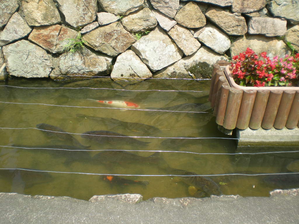 小さな川が流れ、川には花壇が設置され、鯉が泳いでいた。