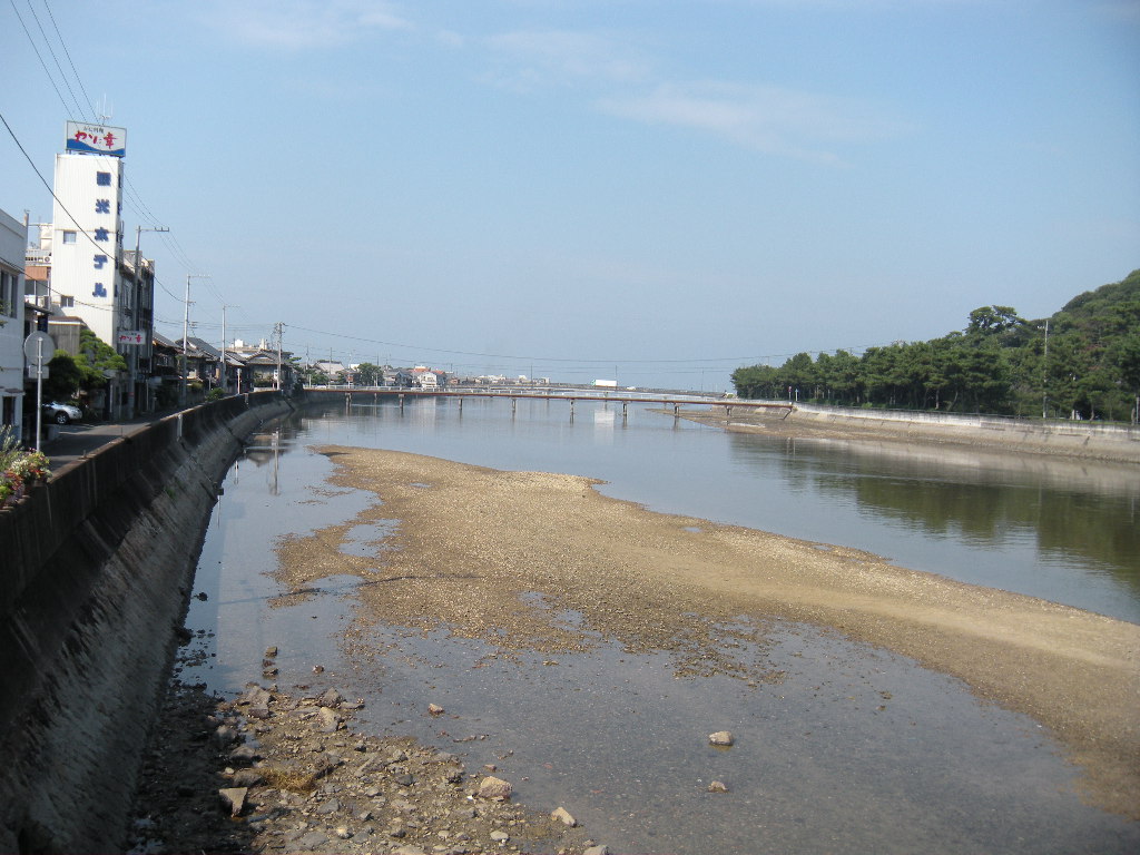 三架橋のうえから見る財田川の下流側。むこうの橋が琴弾橋(歩行のみ)。