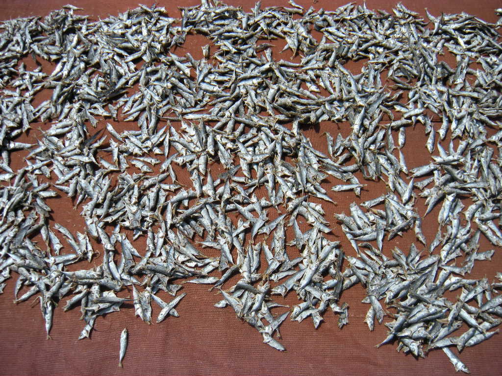 北浦港の防波堤に天日干のイワシ。