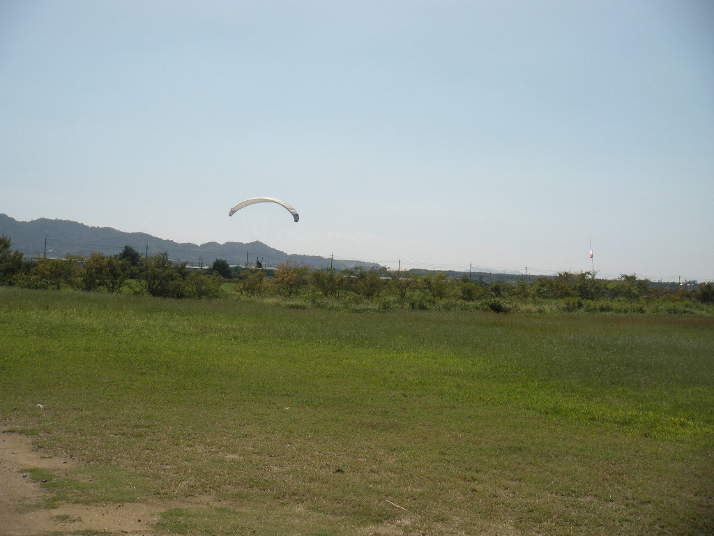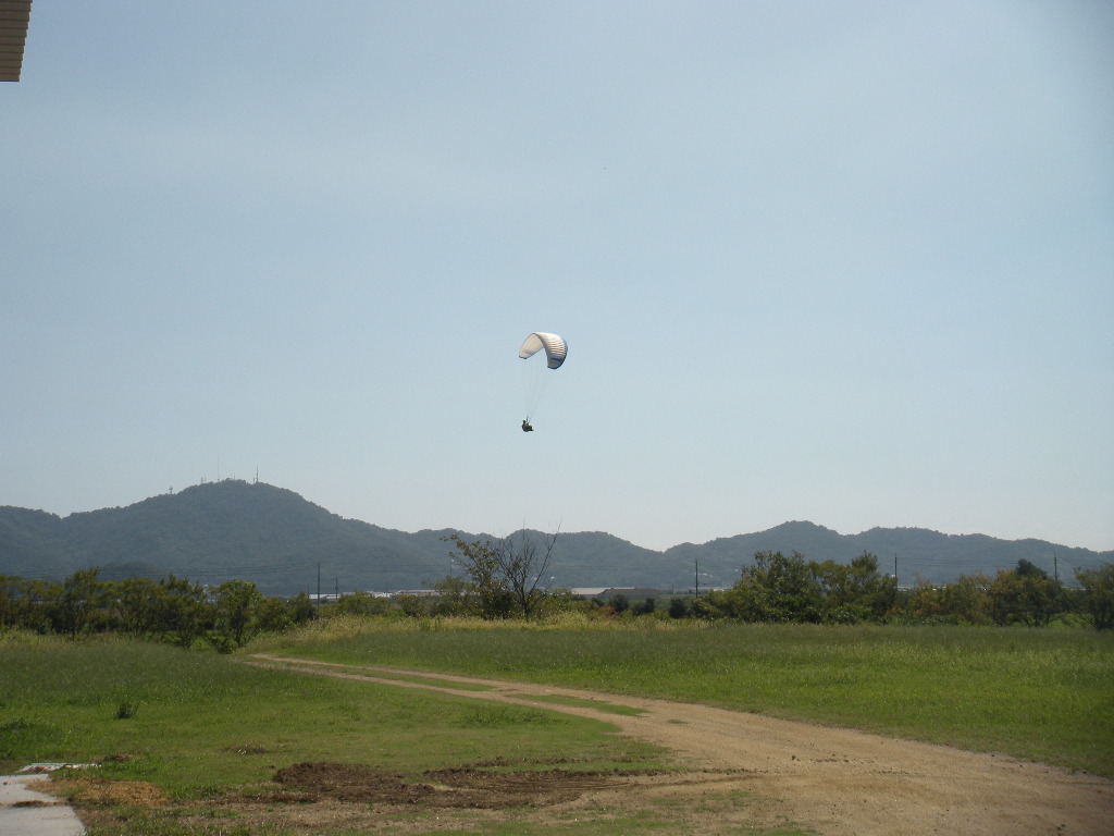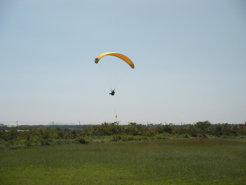着地地点の上空を飛ぶパラグライダー。