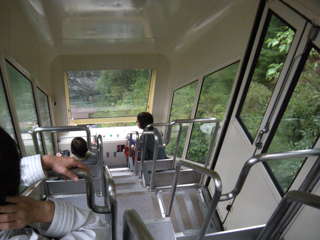 これがケーブルカーの車内。お客さんが運転、もっともスタートボタンを押すだけ。5分間の渓谷美を楽しめる。