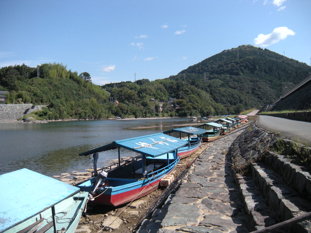 肱川橋のたもとには「大洲のうかい」の屋形船がずーーーーっと並んでいる。