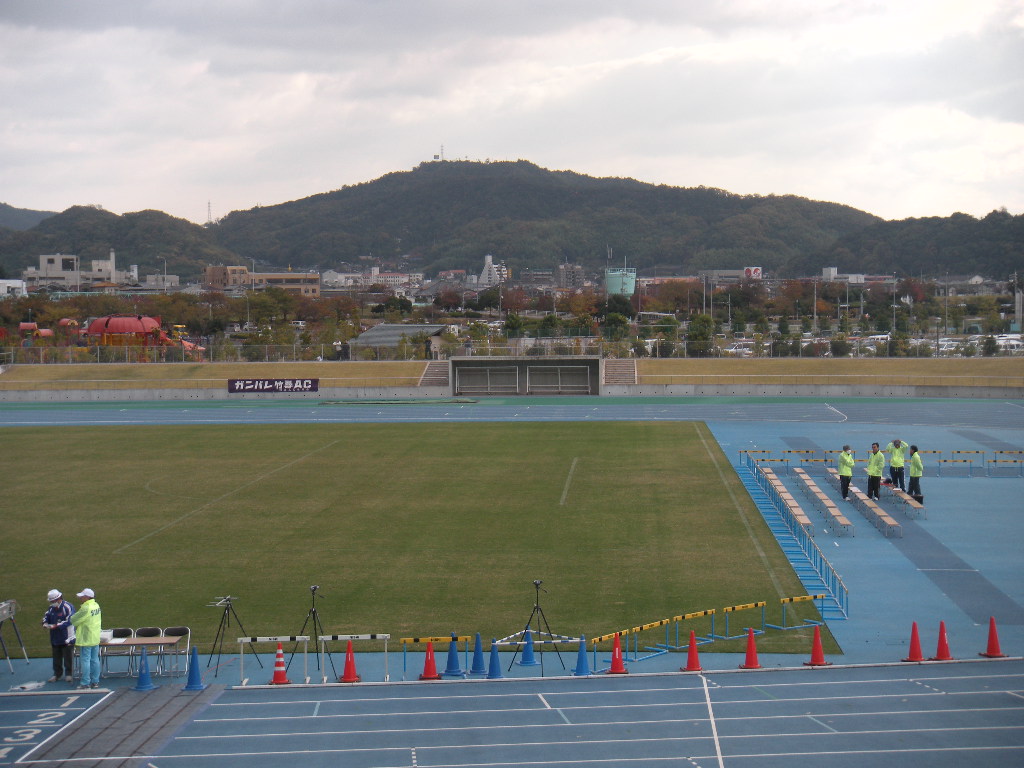 受付を済ませてスタンドの応援席から見る陸上競技場。