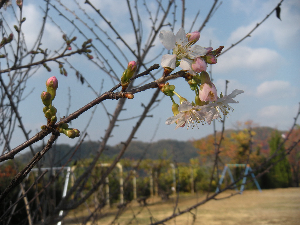 桜が咲いた木が二本あった、珍しい。」びっくりした。