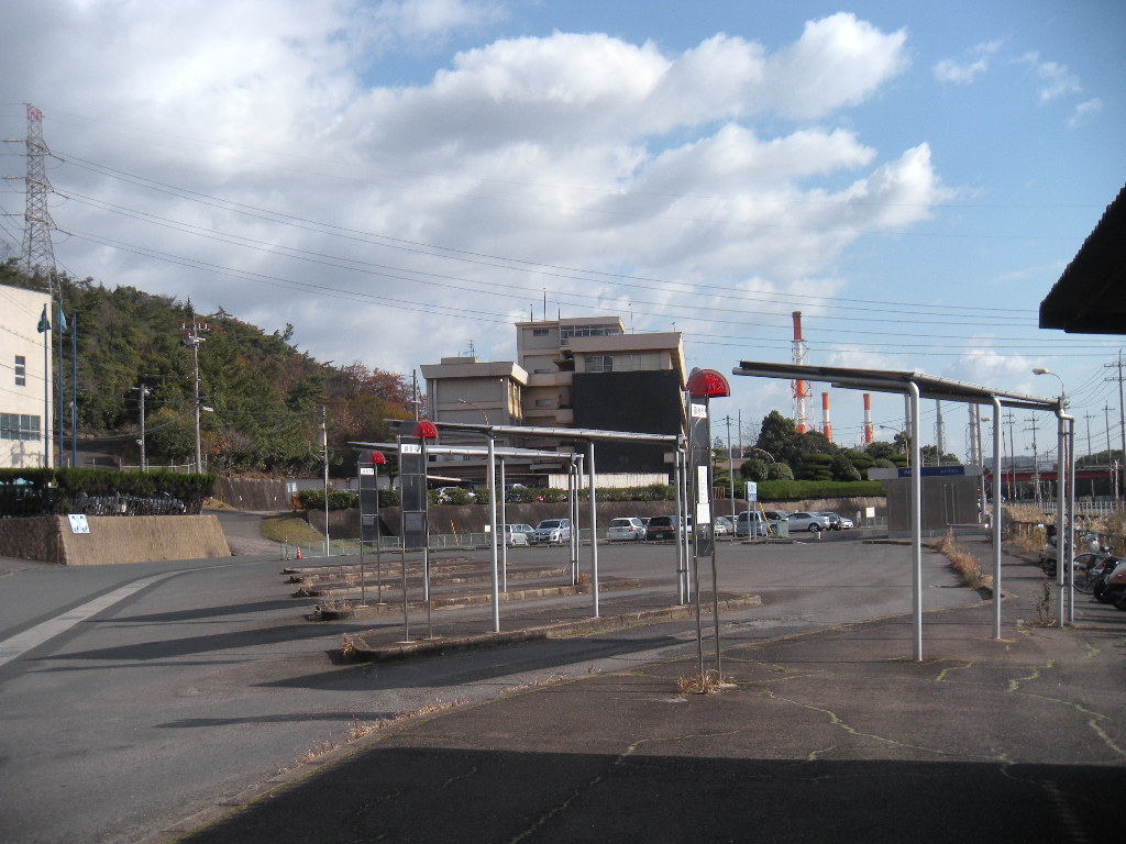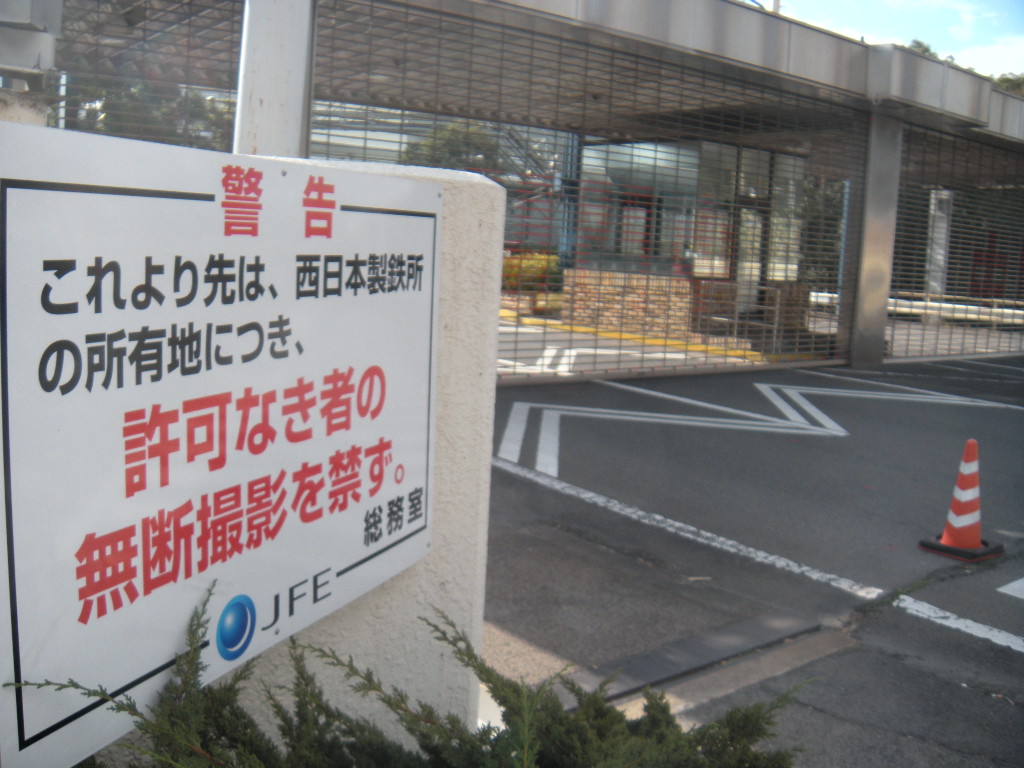 正門前のバス停。誰ひとりいないJFE西日本の福山製鉄所前。