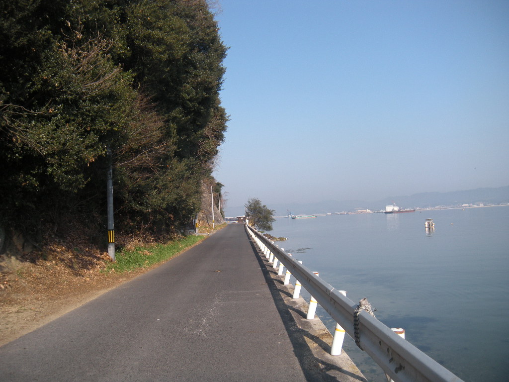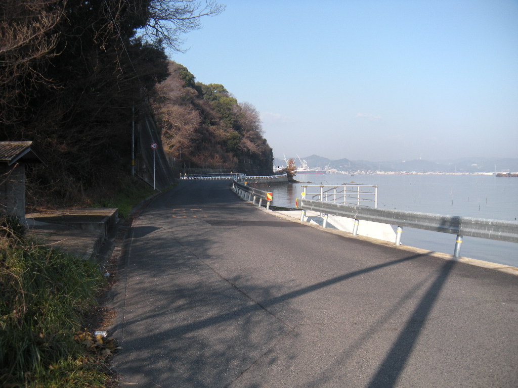 県道の左手が旧塩田の貯木場、右手が漁港になっている。
