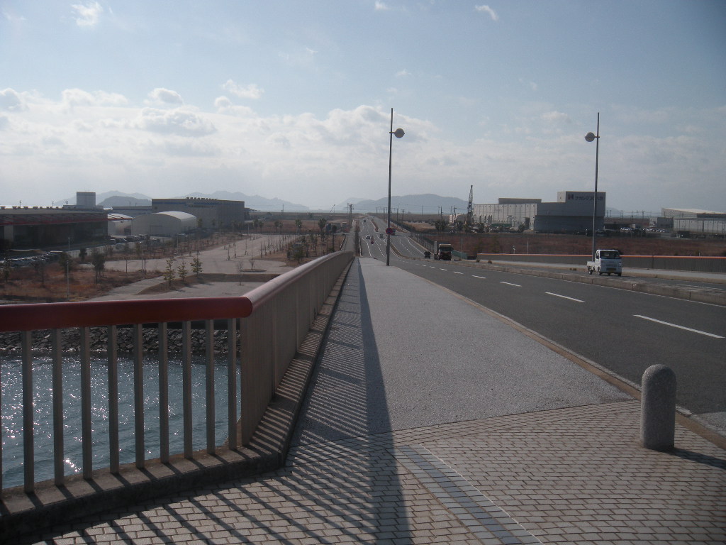 玉島ハーバーブリッジから南へ一直線に中心道路が続いていて、道路の左右は公園のように整備されている。