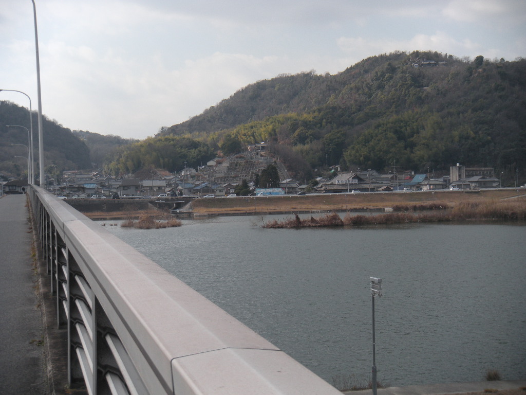 水呑大橋の下を流れる芦田川。左の山のうえが明王台団地。