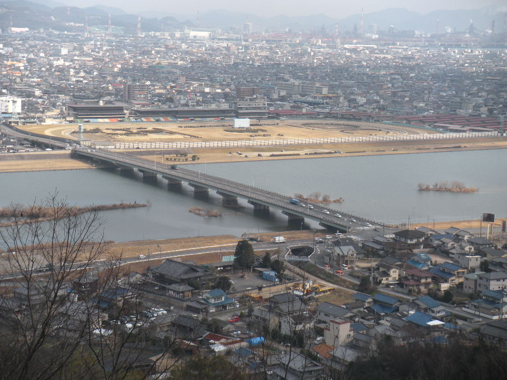 水呑大橋と福山市営競馬場の全景。