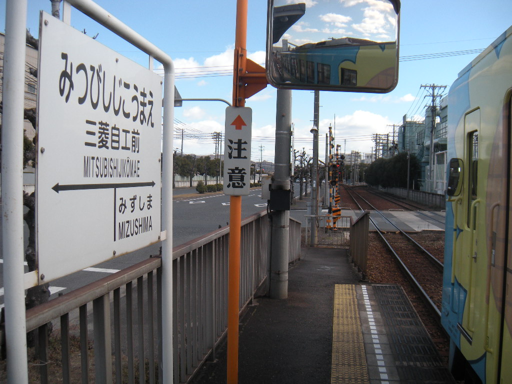 終点・三菱自工前駅。列車を降りたらすぐ道路、ゆう感じ。