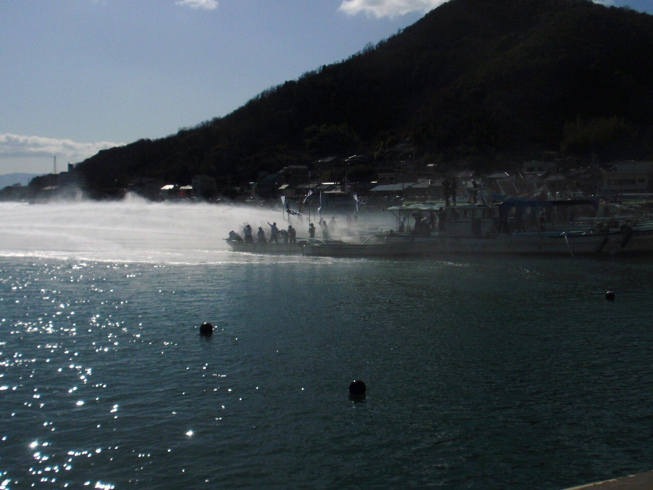 消防団員は気合いを入れた声を出して接岸された小船に乗ったり、ホースをのばしたり、消防車を思いっきり海側ぎりぎりまでバックさせた。