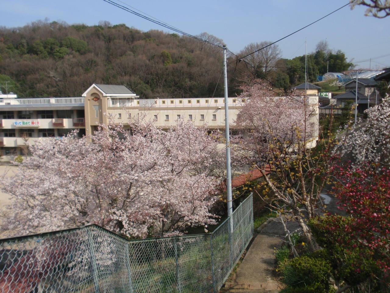桜と桃にの花が校庭から山に向かって咲いている。