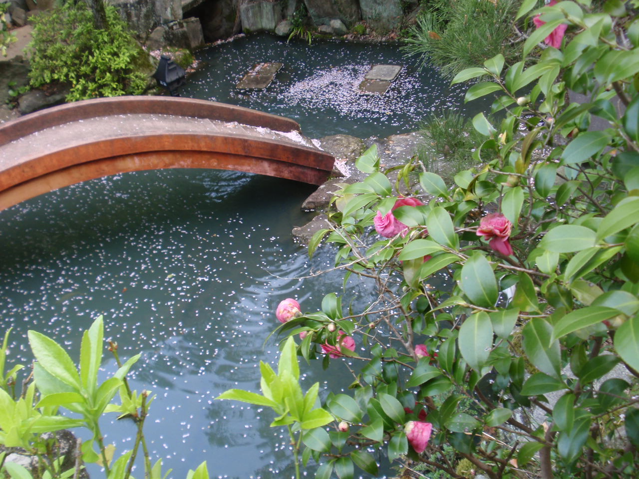 今立川に桜が映り、花びらが散って浮かんでいる。