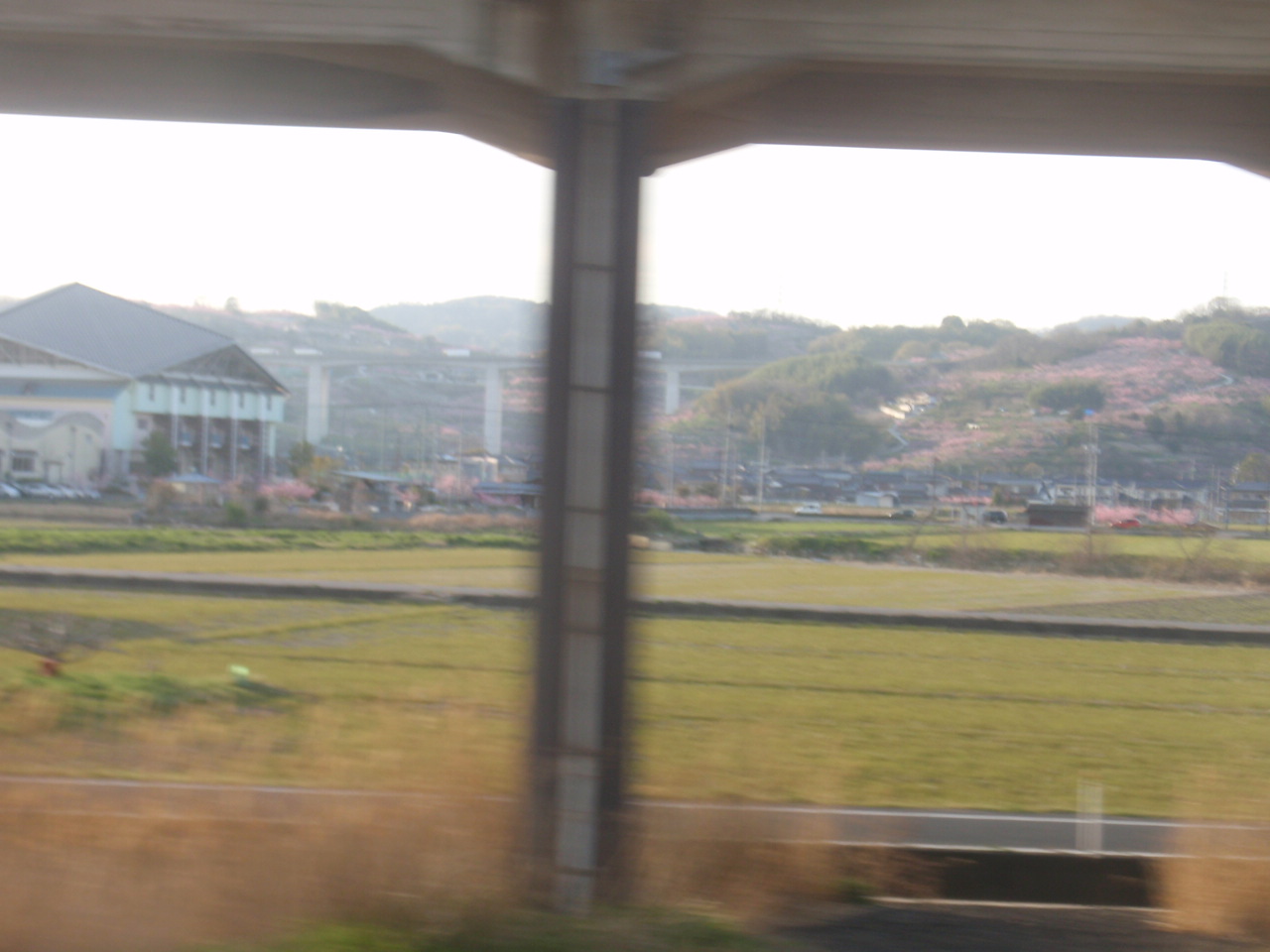 この写真は京都からの帰り、山陽線の電車から見た八島の桃畑。