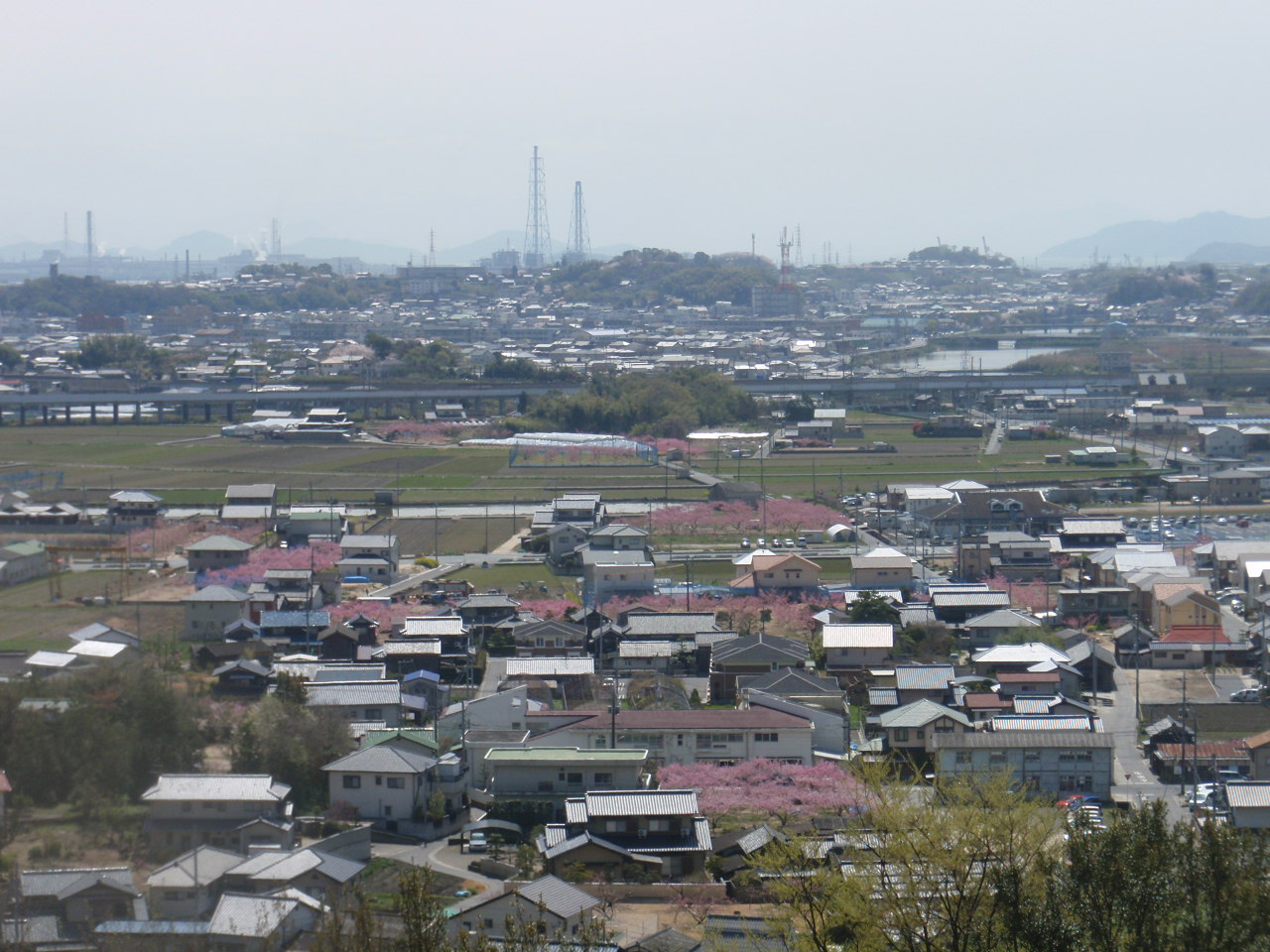 山陽道のうえを越えると南に八島の住宅・桃畑・田んぼ、それに乙島の中電発電所が見える。