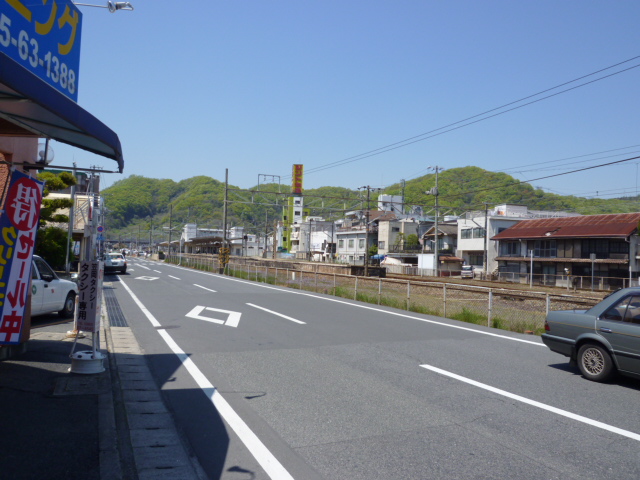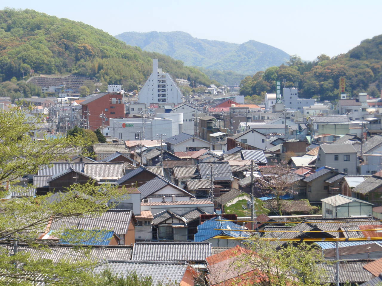 手前が威徳寺の本堂の屋根、次に国道2号線やホリディが見える。