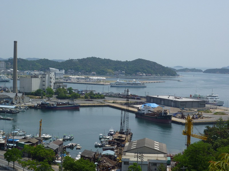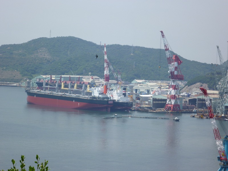 さっき進水式をしたばかりの5万トン貨物船が見える。