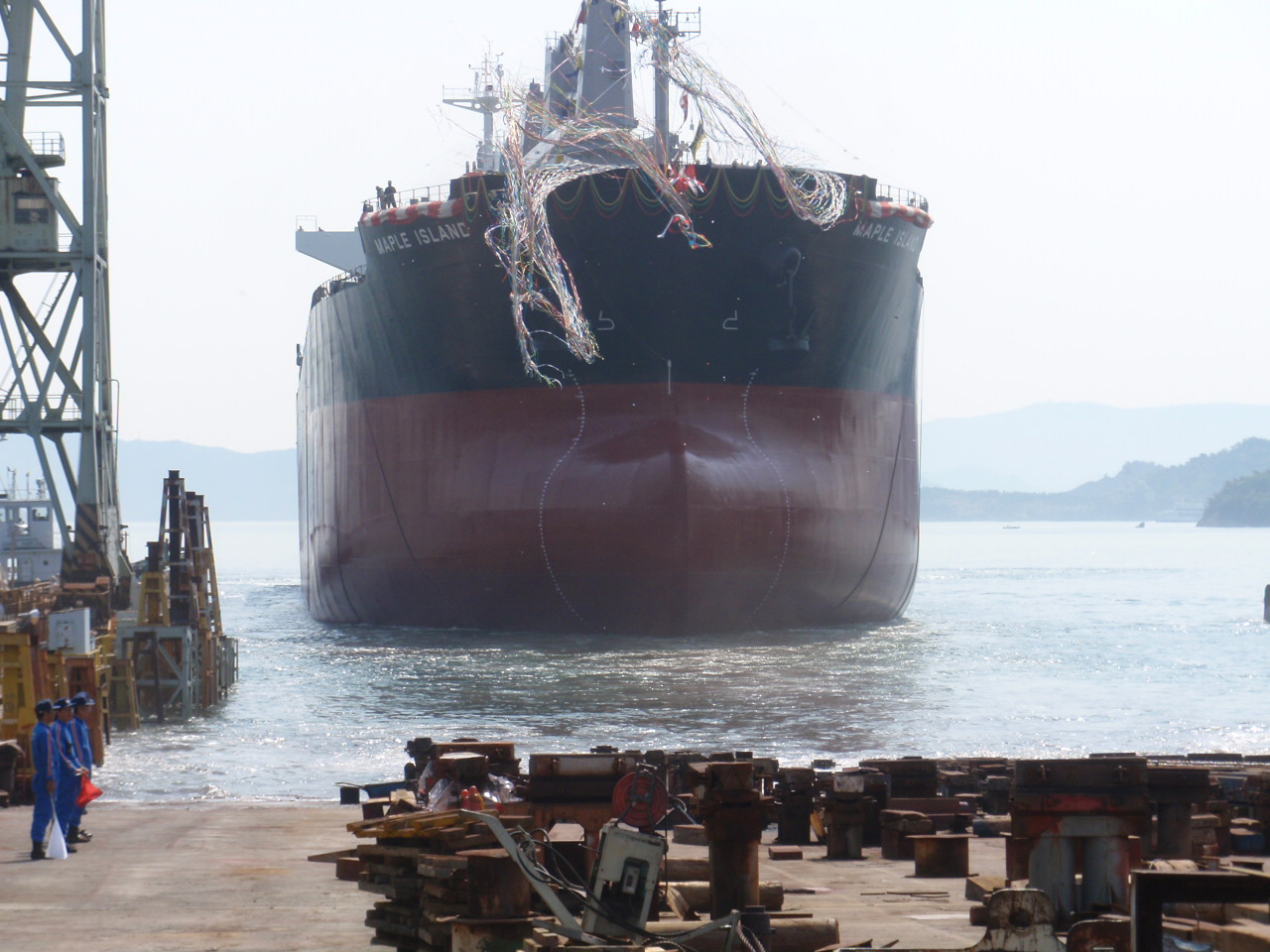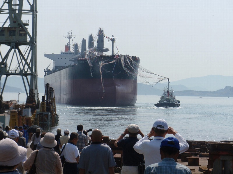 滑走から海の沖へ自然と進む新造船。