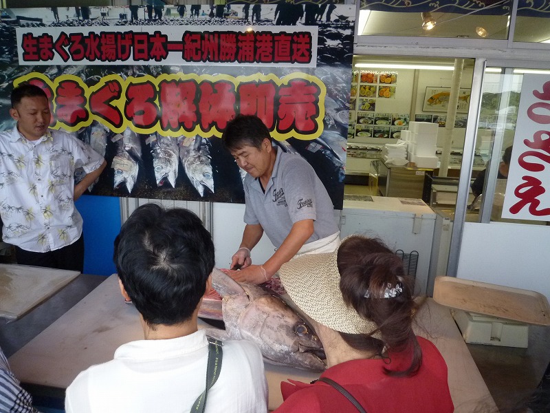 解体したマグロはその場で販売し、骨の間に残った身はサジですくって大皿に移し、それをツアー客に爪楊枝で食させた。