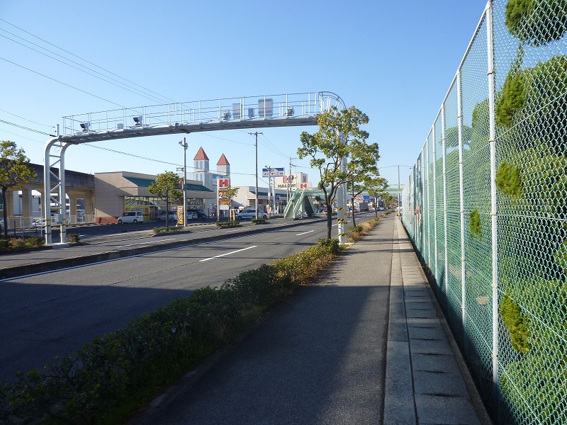 正面にハローズが見えてくる、右のフェンスは湯田小学校。