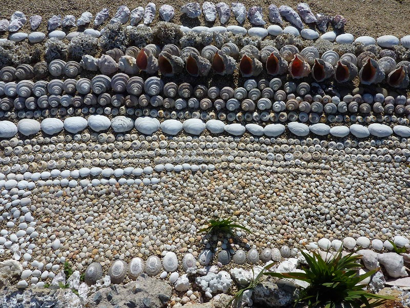 海水浴場の道に面した或るお宅の庭。お金も使わず貝殻で見事な庭になっている。